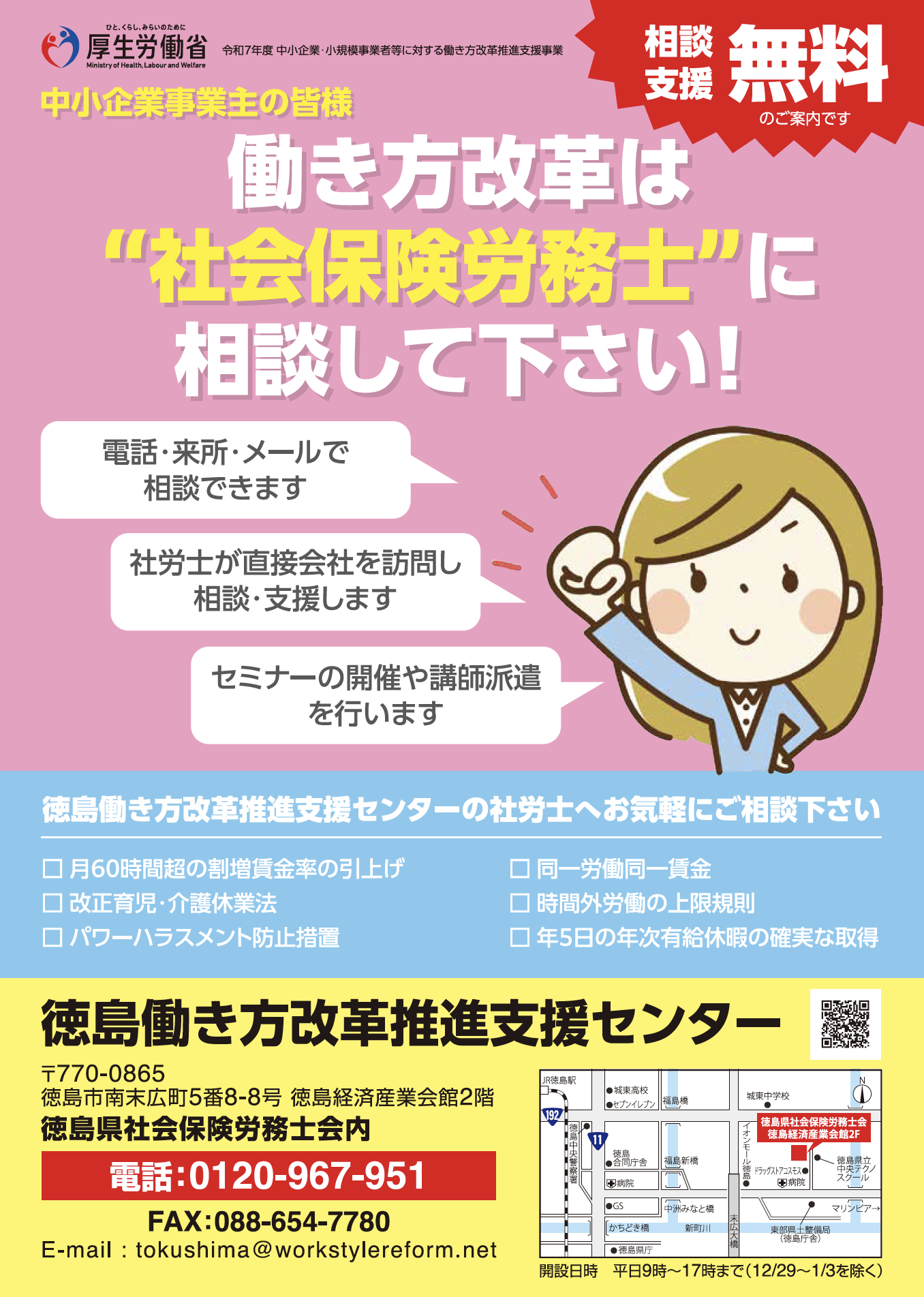 徳島働き方改革推進支援センターの社労士へお気軽に相談下さい